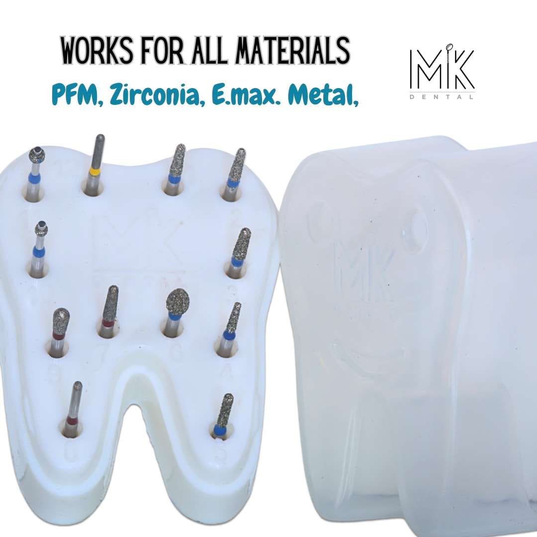 The MIK Dental Basic Bur Kit is a 12-bur system thoughtfully designed to cover all your basic routine tooth preparations—from crowns to veneers. Crafted with depth control, safety, and anatomical accuracy in mind, it’s your go-to kit for cost effective, consistent and high-quality outcomes.