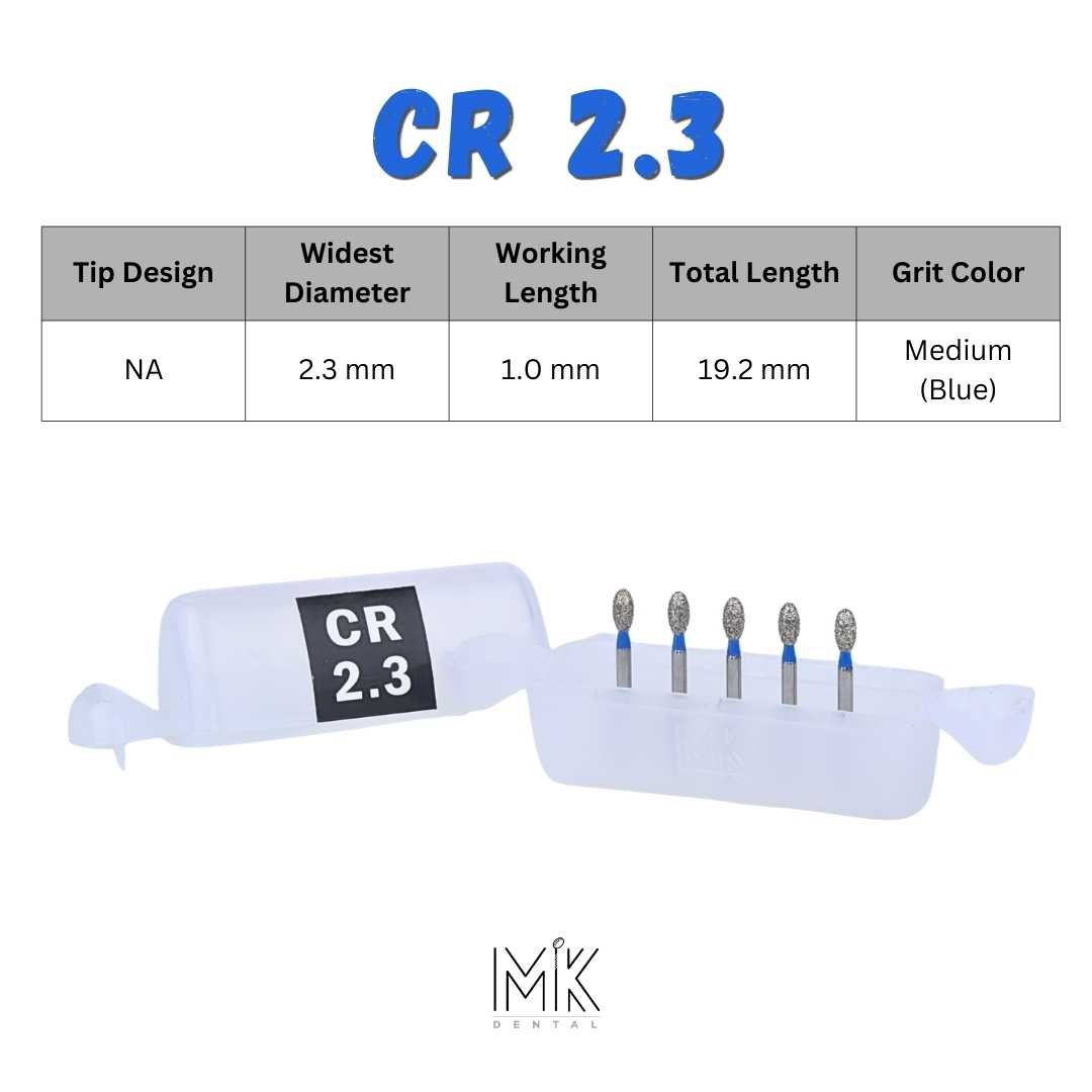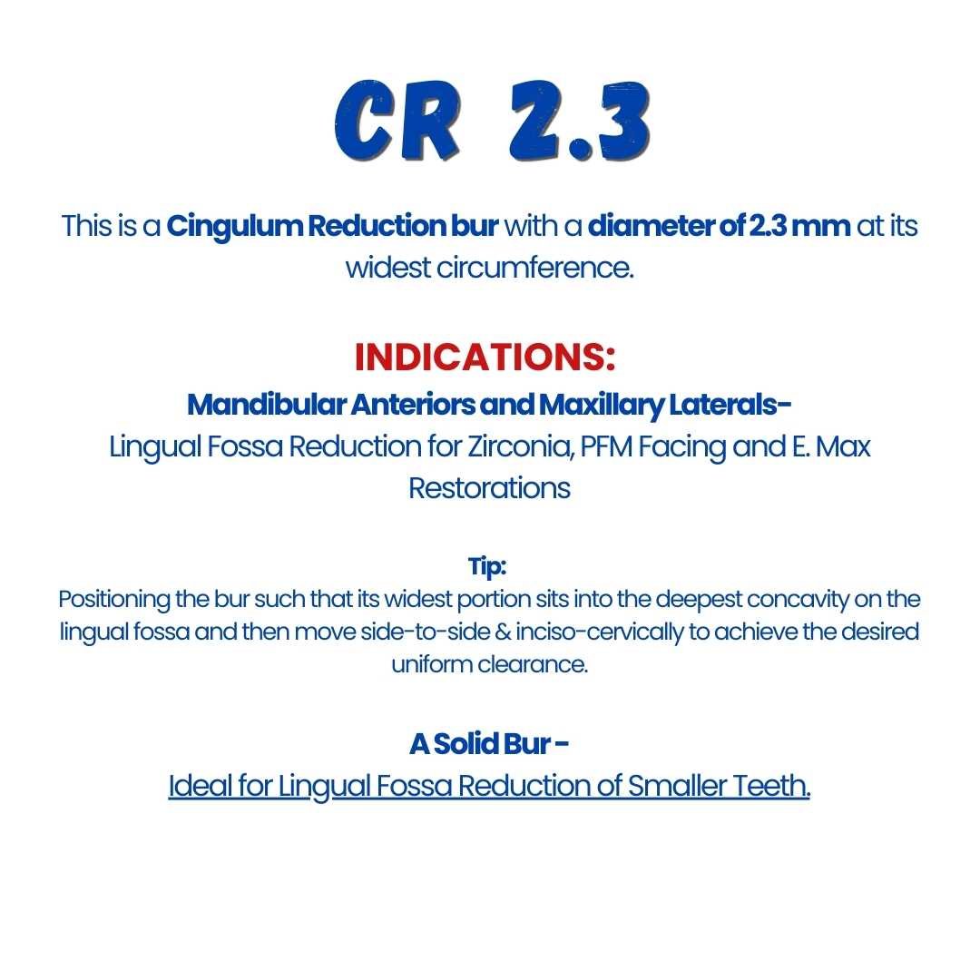 The CR 2.3 is a Cingulum Reduction bur featuring a 2.3 mm diameter at its widest point.