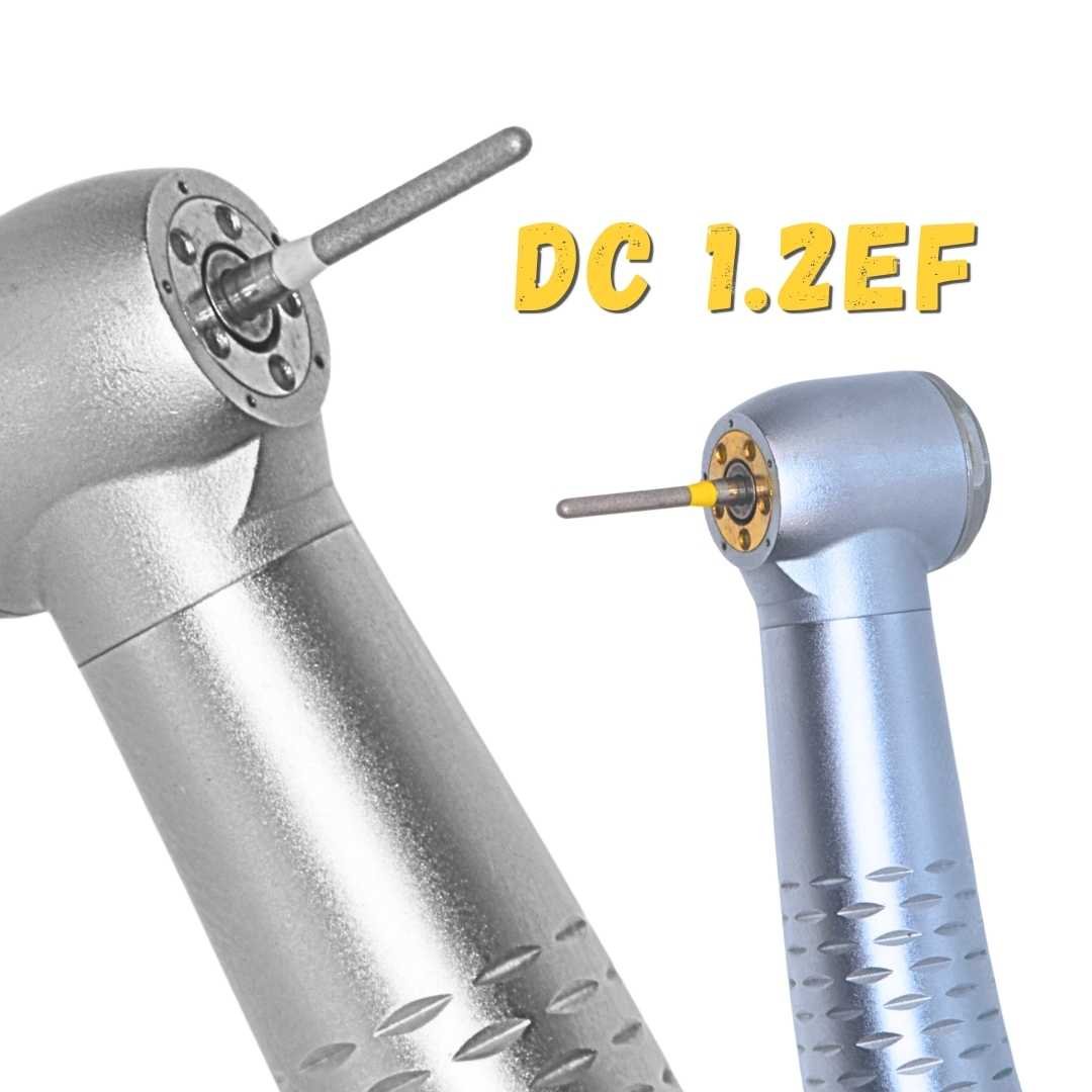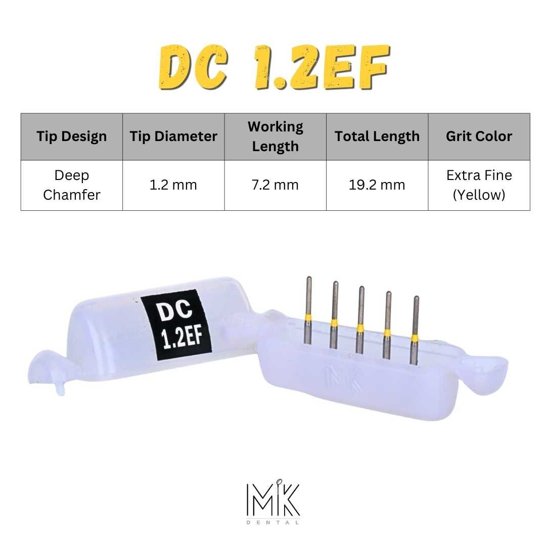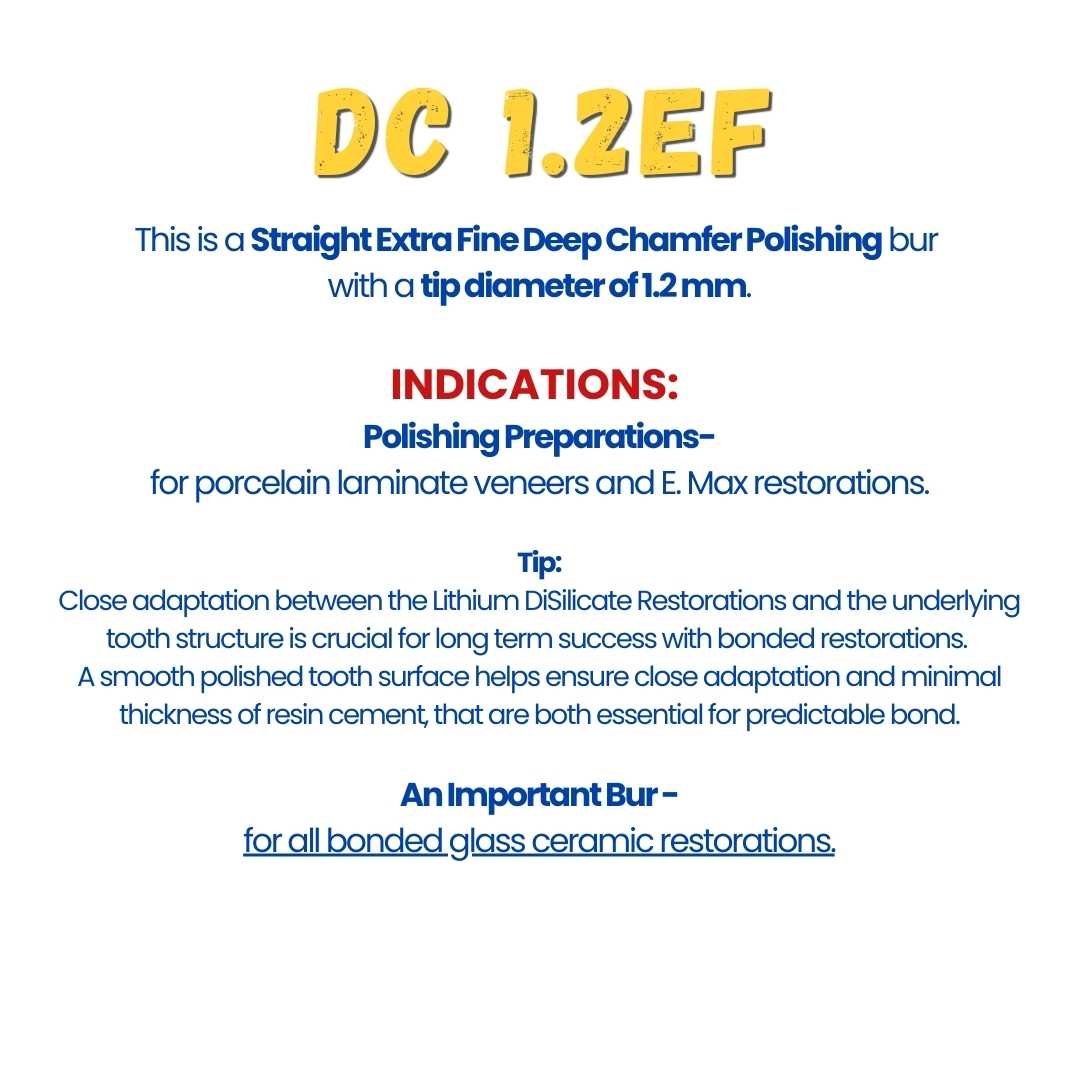 The DC 1.2EF is an Extra Fine (Yellow Ring) Deep Chamfer Polishing bur with a 1.2 mm tip diameter.