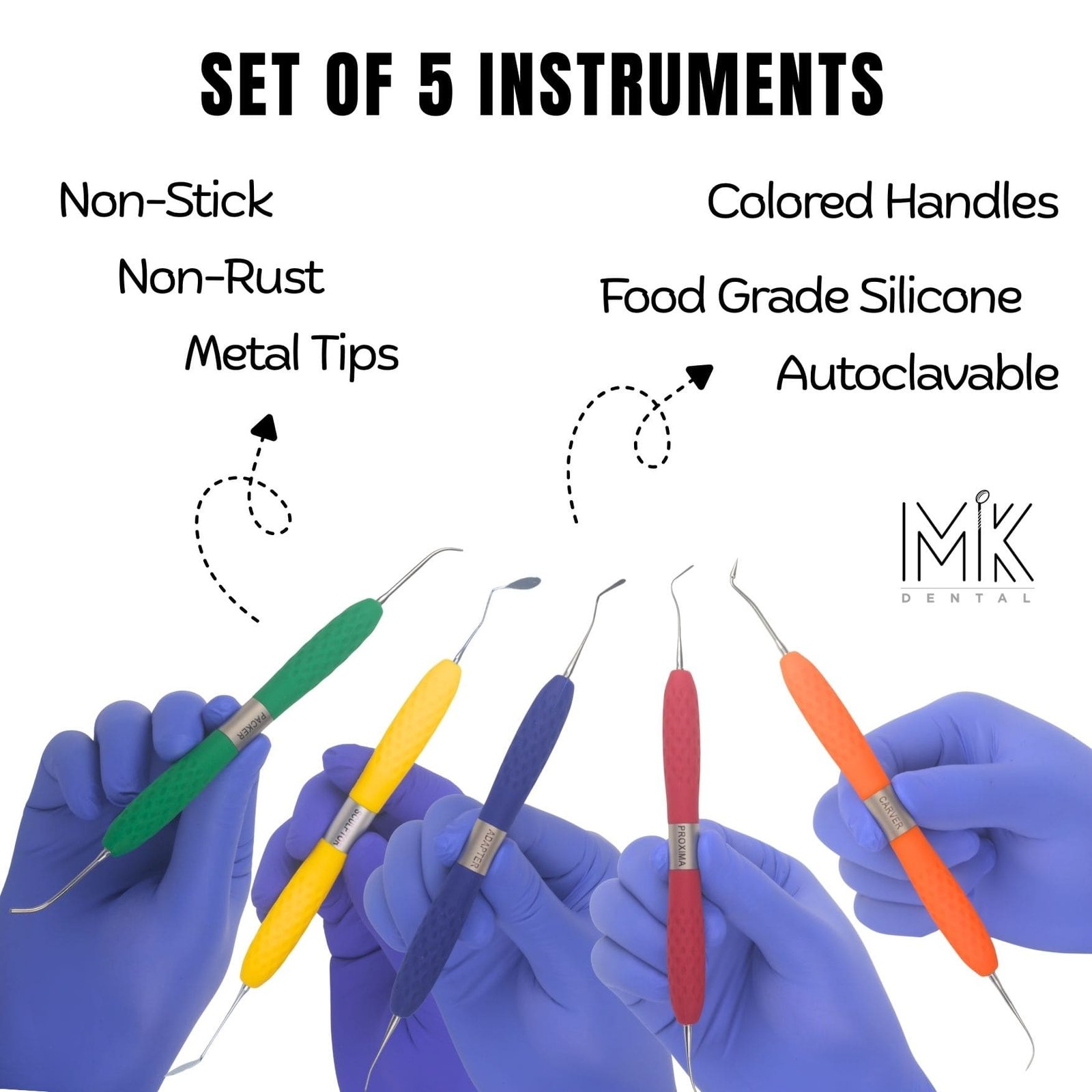 Each of the 5 instruments is designed to eliminate the common frustrations of composite work: sticky pull-back, poor adaptation, and imprecise carving.