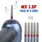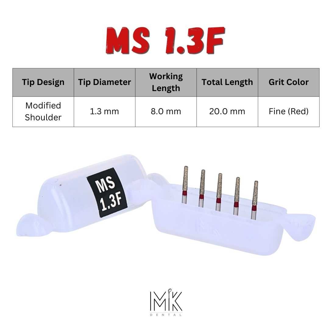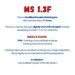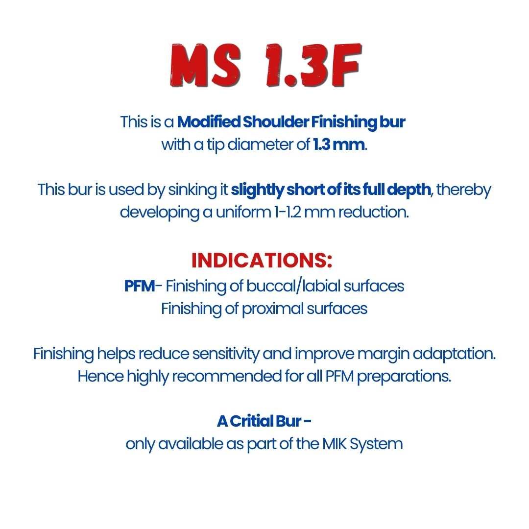 The MS 1.3F is a Modified Shoulder Finishing bur with a 1.3 mm tip diameter, designed for refining buccal and proximal margins in PFM prostheses.