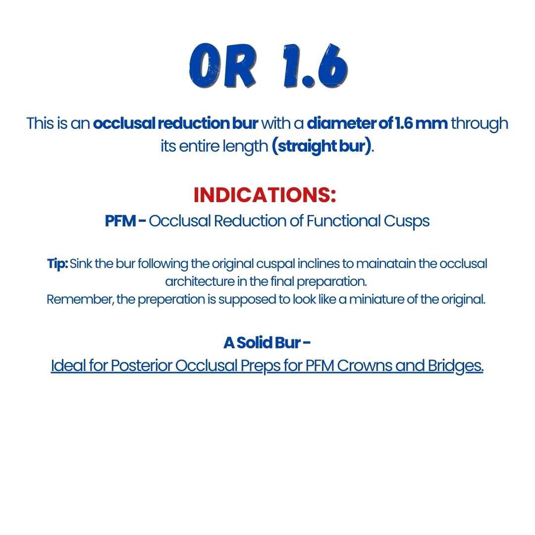 The OR 1.6 is an Occlusal Reduction bur featuring a straight cylindrical design with a 1.6 mm tip diameter.
